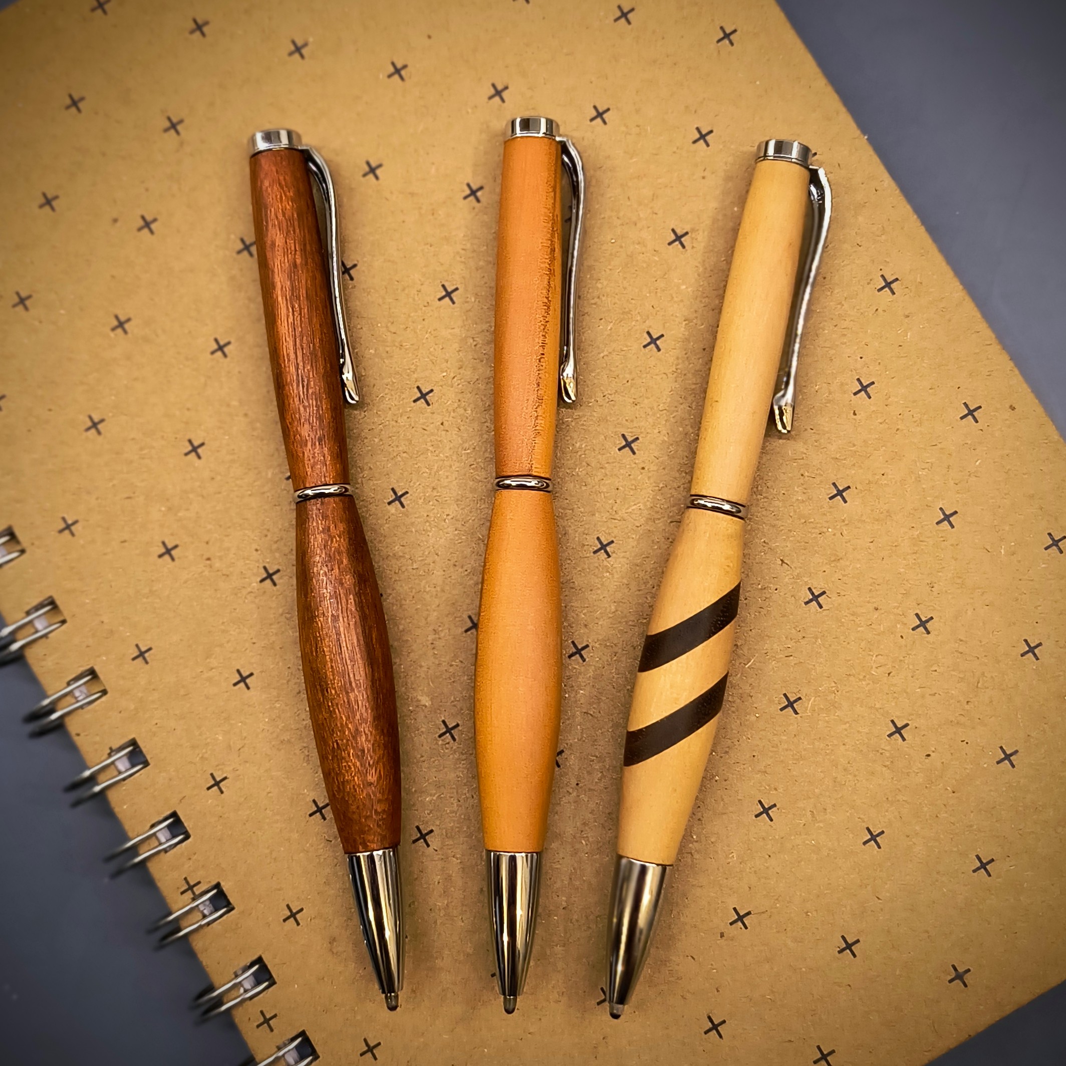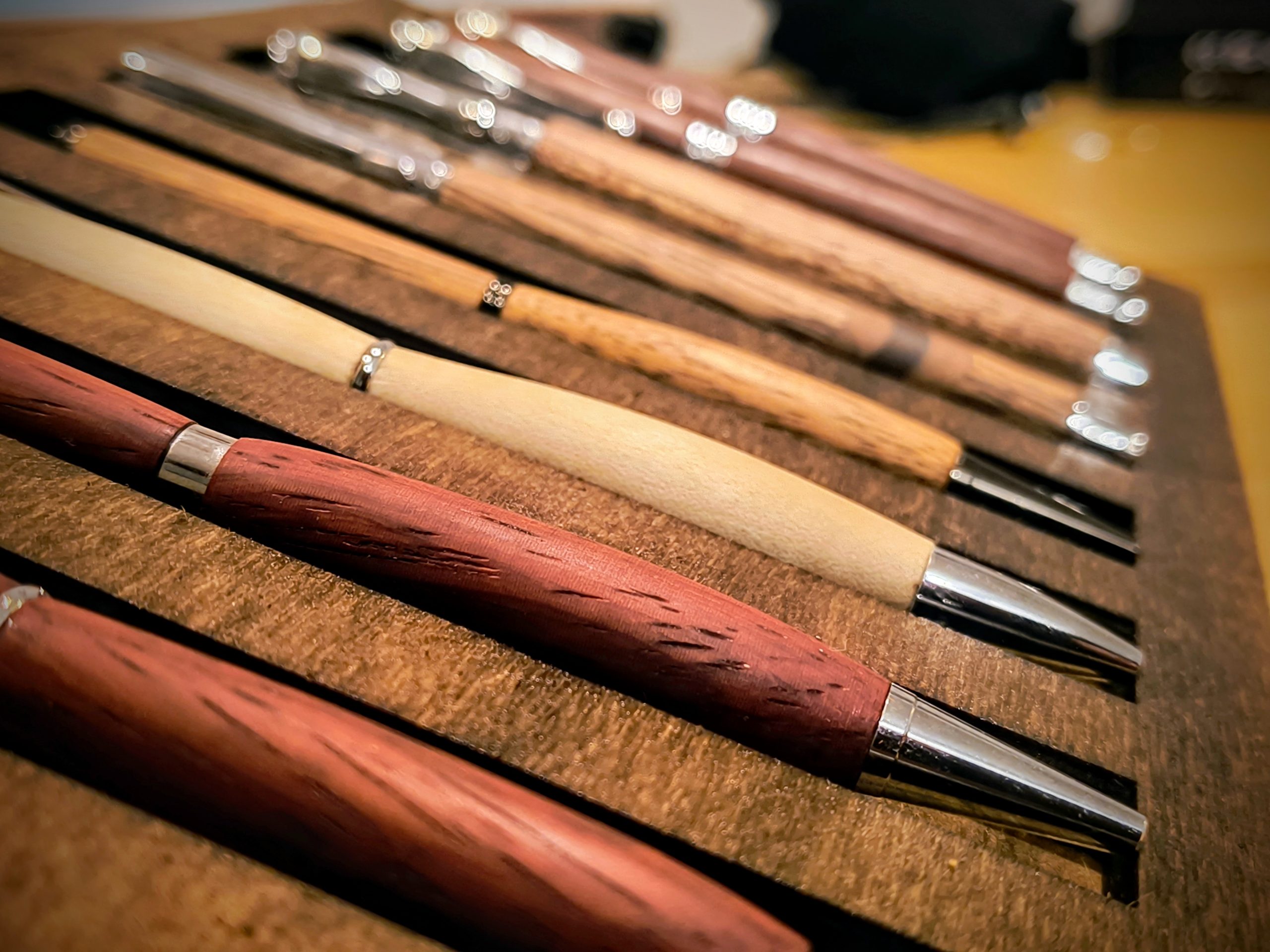 Ob Kugelschreiber oder Füller, alle Schreibgeräte werden von Hand hergestellt. Die glatte und weiche Oberfläche des Holzes lässt jeden Plastik-Kugelschreiber alt aussehen.